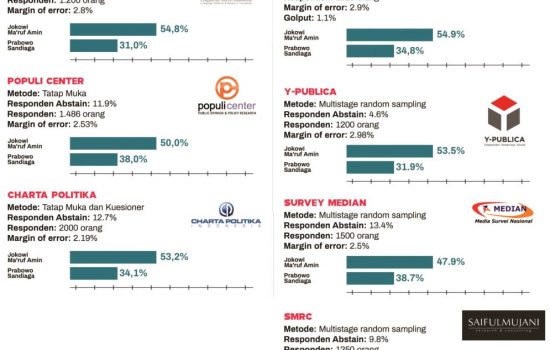 Terkait dengan beberapa lembaga survei seperti LSI Denny JA dan Populi Center yang memenangkan pasangan Jokowi-Ma’ruf Amin. ”Ya, ini mirip-mirip waktu DKI, semua (lembaga) di DKI juga begitu. Kita terima masukan aja,” kata mantan Wagub DKI itu.